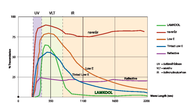 The blue graph illustrates the percentage of solar radiation transmission at various wavelengths through LAMKOOL glass, which possesses radiation-filtering properties. It shows that wavelengths between 380-780 nanometers are transmitted at relatively high levels (50-70%), indicating substantial visible light penetration. However, beyond 780 nanometers, transmission decreases progressively; at 1000 nanometers, transmission is 20%, and at 1500 nanometers, it drops to 10%, reaching nearly 0% at 2000 nanometers. Thus, LAMKOOL glass exhibits superior heat reduction performance compared to ordinary glass.